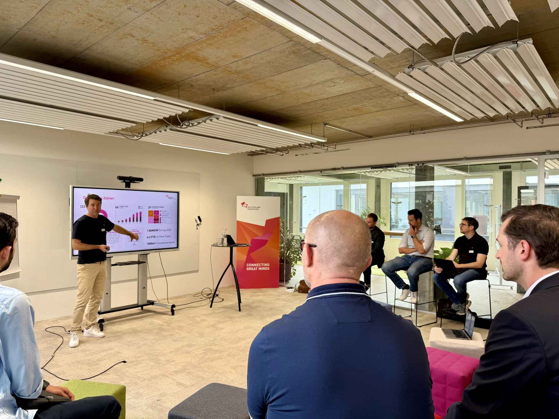 Zusätzlich stellte Sem David Mattli unseren Start-up Hub vor. Dieser unterstützt Start-ups mit einem starken Netzwerk, individueller Beratung sowie Angeboten in den Bereichen Finanzierung, Wachstum, Marktzugang und Sichtbarkeit. Ergänzt wird das Angebot durch Akzelerator-Programme und flexible Arbeitsmöglichkeiten bei uns in Rotkreuz.