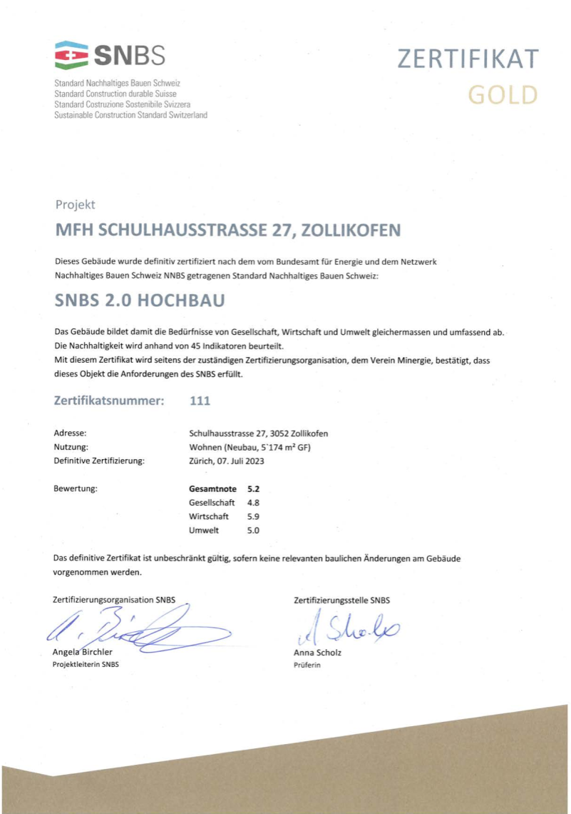 Das Grundstück an der Schulhausstrasse 27 wurde nach dem Auszug der Postfiliale aus der alten, eingeschossigen Liegenschaft neu genutzt. Bei der Entwicklung des Ersatzneubaus legte man grossen Wert auf nachhaltiges Bauen. Nach diesem Grundsatz wurden auf dem Grundstück zwei Mehrfamilienhäuser mit 38 Mietwohnungen realisiert, welche sich durch Nachhaltigkeit auszeichnen. (Gebäudelabel "Gold" nach SNBS Standard, www.snbs-cert.ch).