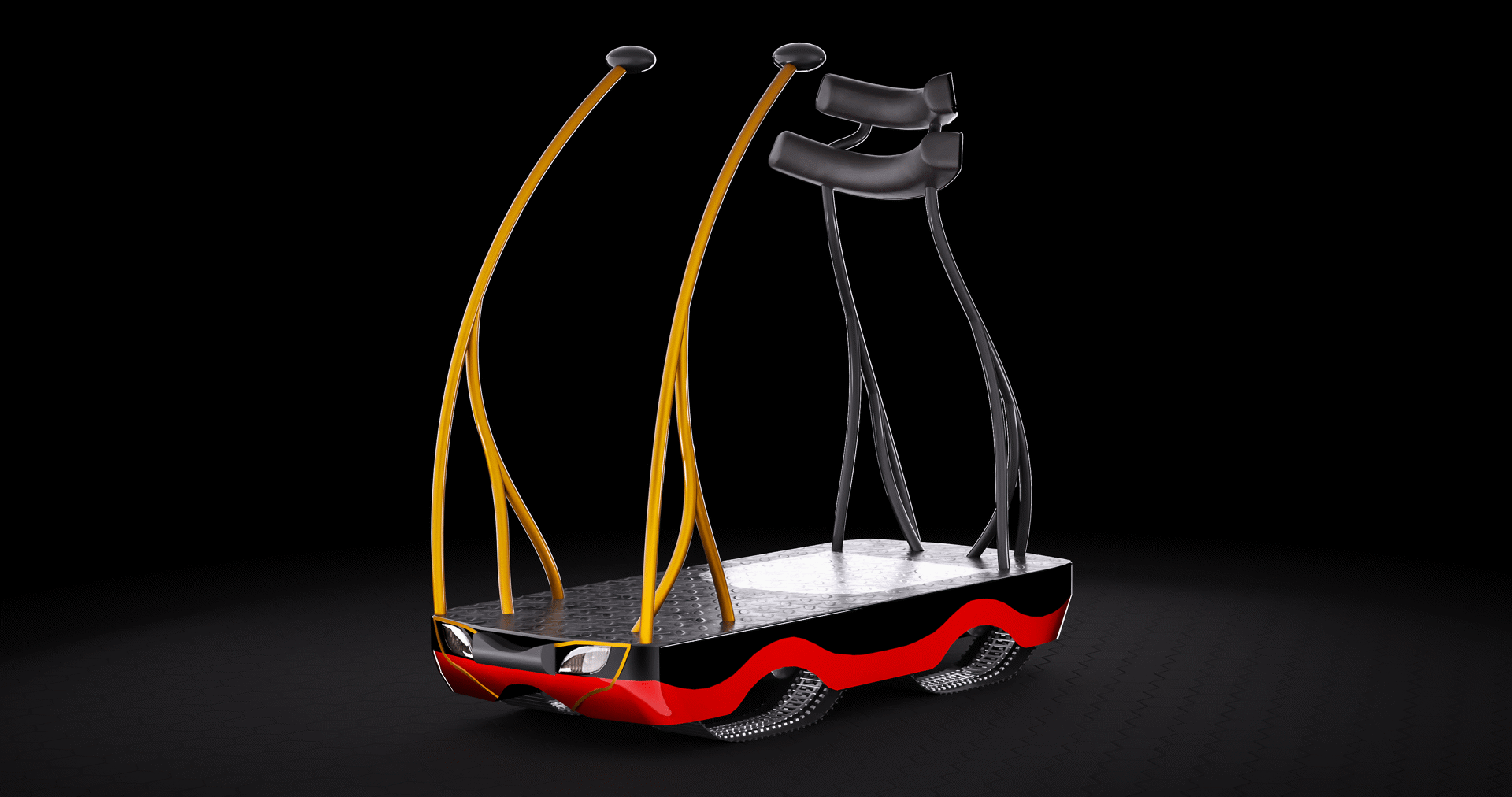 D) As tracks can change height, our vehicle can recline at turn and thus does not require a person to balance on it. This makes it compatible with self-driving (which is not the case of majority of 2-3 and even 4 wheelers). It can recline at turns offering natural posture and removing a need to balance. When driving on slopes it can maintain platform horizontal. It also means that vehicle should be able to drive and park itself without a passenger when needed.